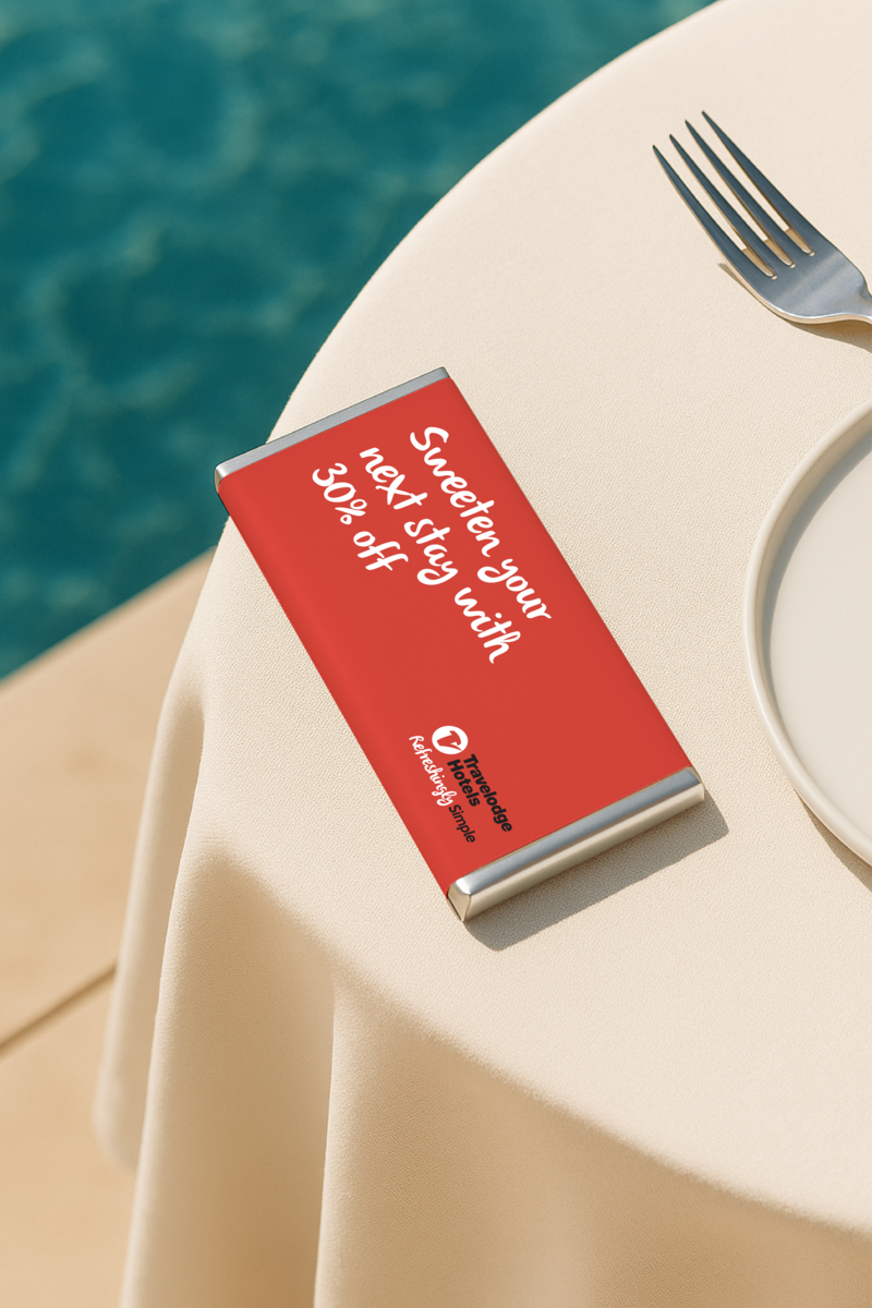 No — all artwork and setup are complimentary. Our design team creates your chocolate bar artwork in-house to ensure it’s perfectly aligned with your hotel’s brand. Prefer to handle design internally? We can share our template for your creative team to use.
